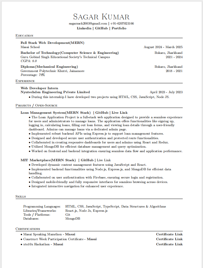 I am Sagar Kumar, a dedicated and ambitious Computer Science Engineer currently Graduated from Guru Gobind Singh Educational Society's Technical Campus, Kandra, Chas Bokaro. Alongside my B.Tech studies, I have also completed a diploma program at Government Polytechnic Khutri Bokaro, which has strengthened my foundation in engineering. I have honed my expertise in Software development, mastering technologies that bring ideas to life on the web. My strong foundation in various programming languages and a deep understanding of data structures and algorithms empower me to tackle complex problems with innovative solutions. My problem-solving mindset, combined with a commitment to continuous learning, drives me to stay at the forefront of technology trends and best practices. I'm eager to contribute my skills in dynamic teams where I can grow and make a meaningful impact on projects that push the boundaries of technology.